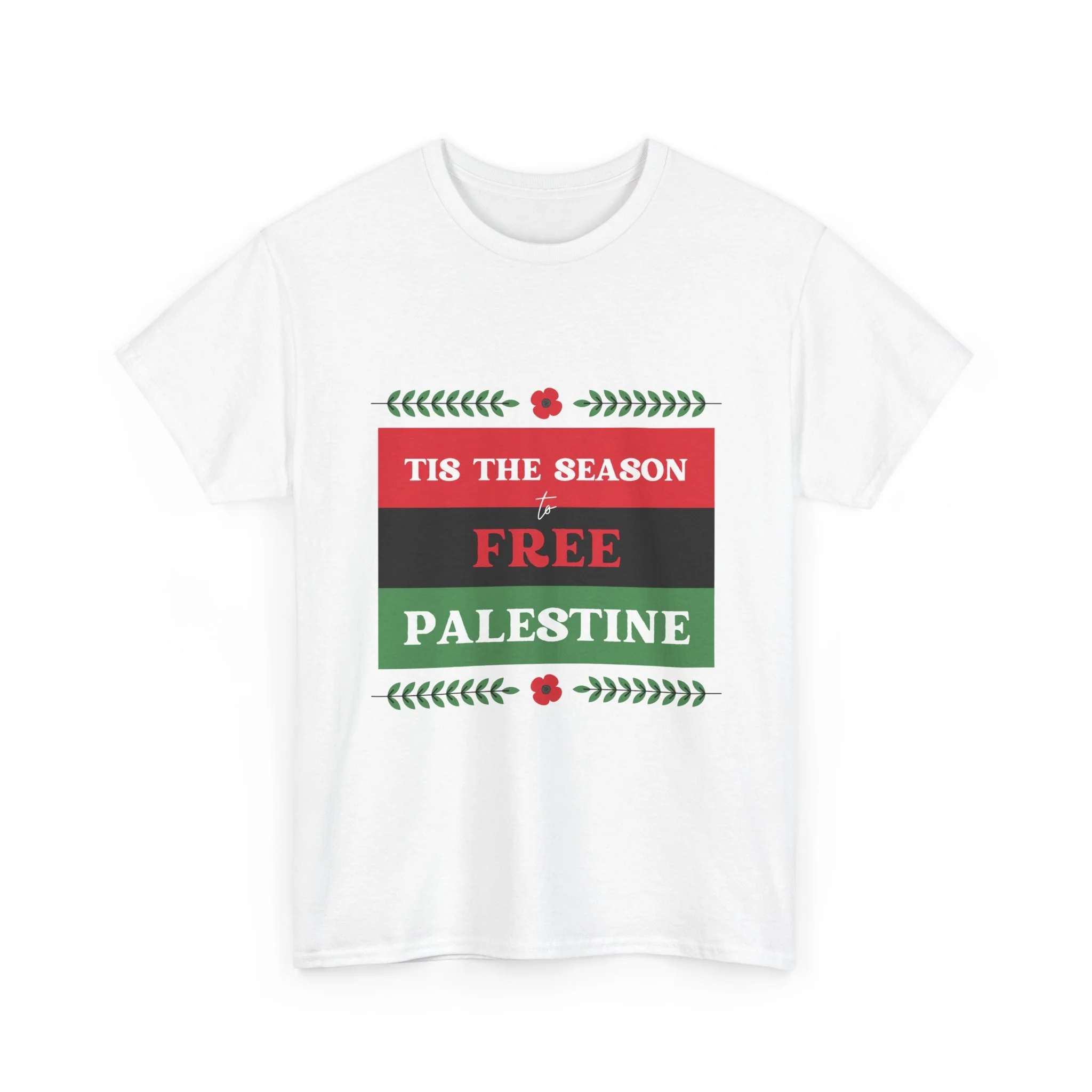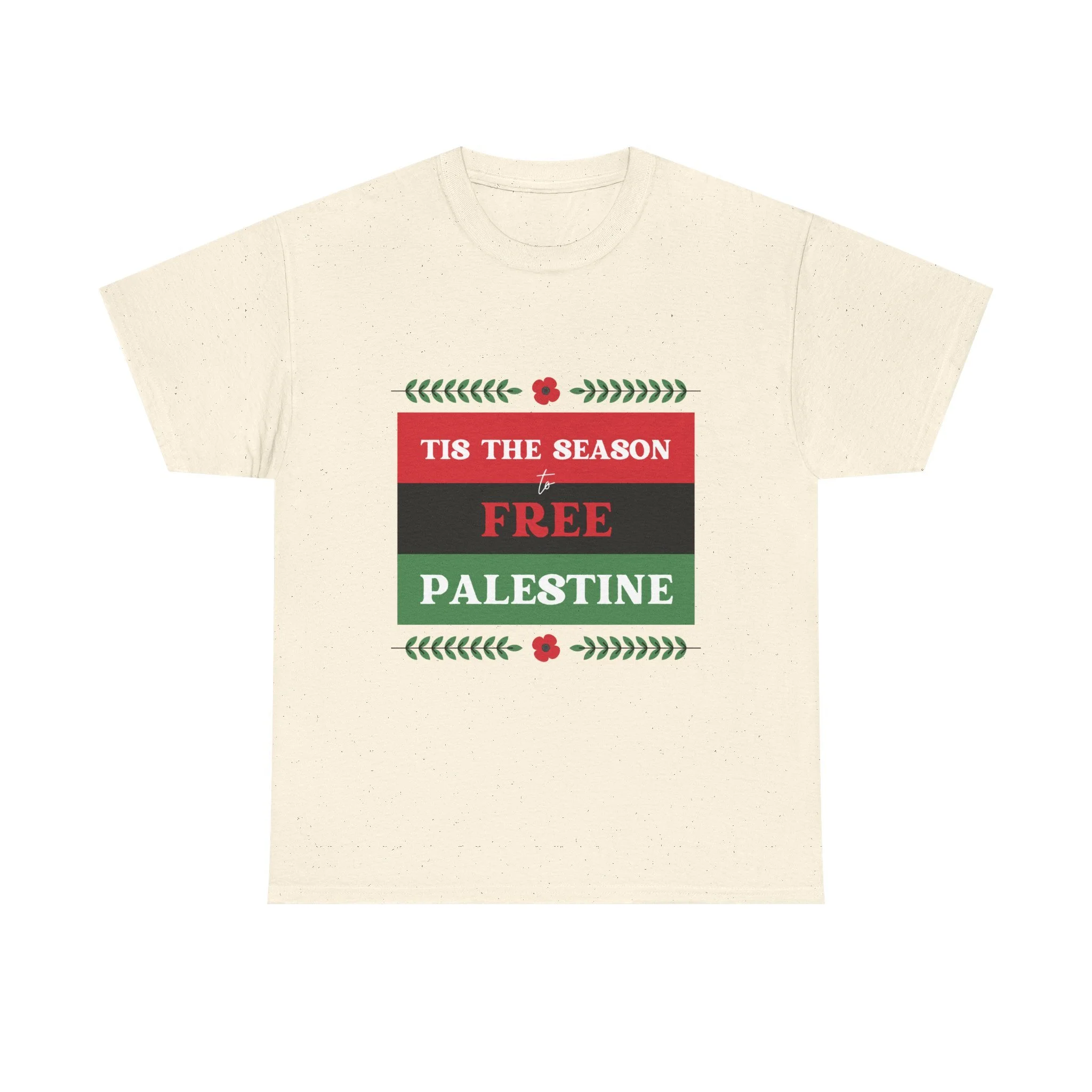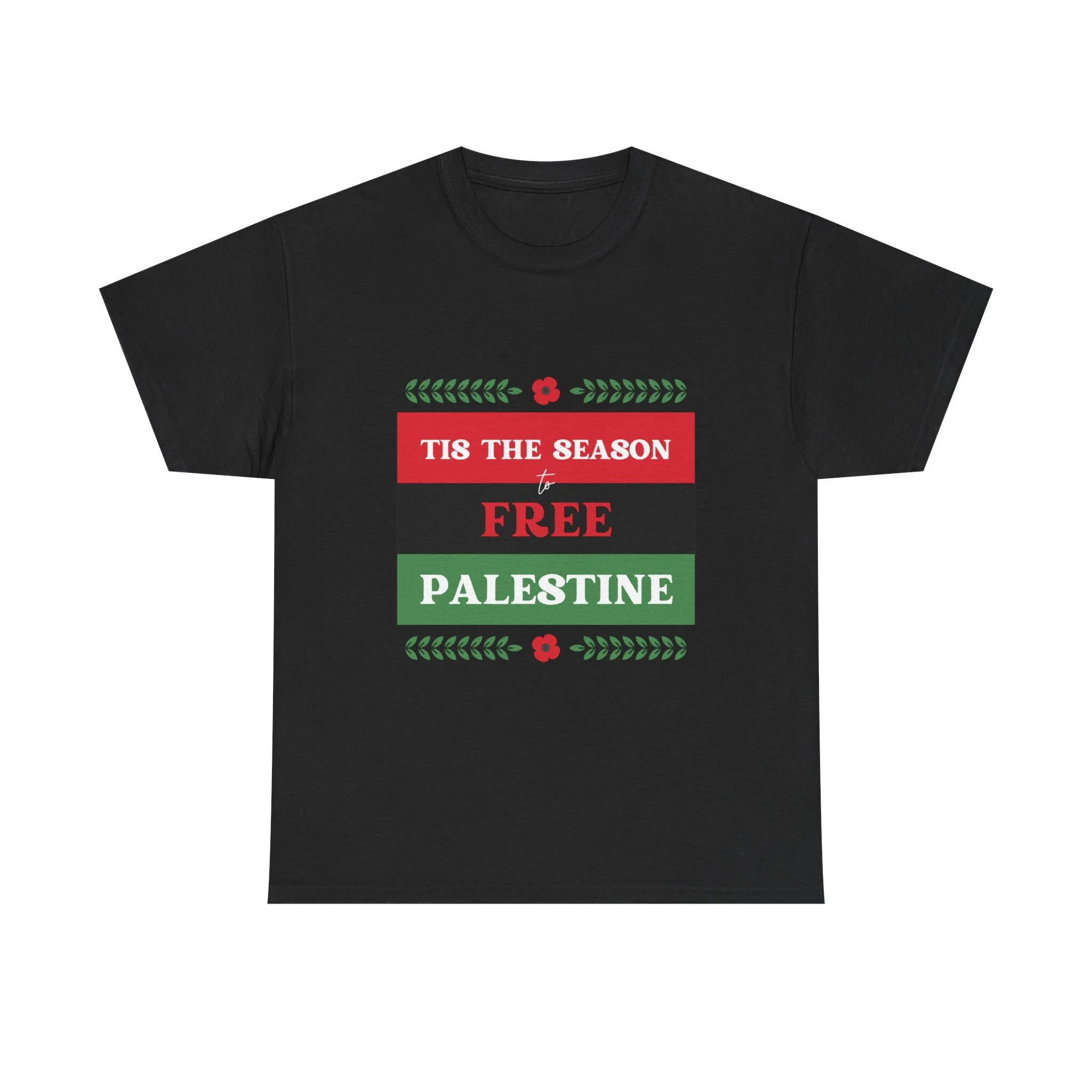 This soft, classic crewneck tee carries a clear, heart-led message wrapped in holiday colors. The front print reads “Tis the season to FREE PALESTINE” in bold red, black and green bands framed with small floral and laurel accents. Wear it to quietly stand with a cause, spark conversations, and bring a sense of community to gatherings. The relaxed fit and smooth print let the statement feel comfortable — like a warm invite to share stories, stand together, and keep hope visible during seasonal events and everyday life.