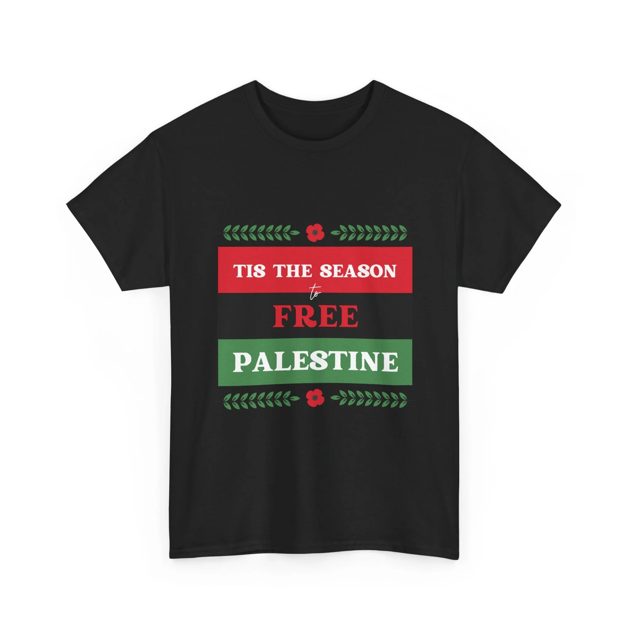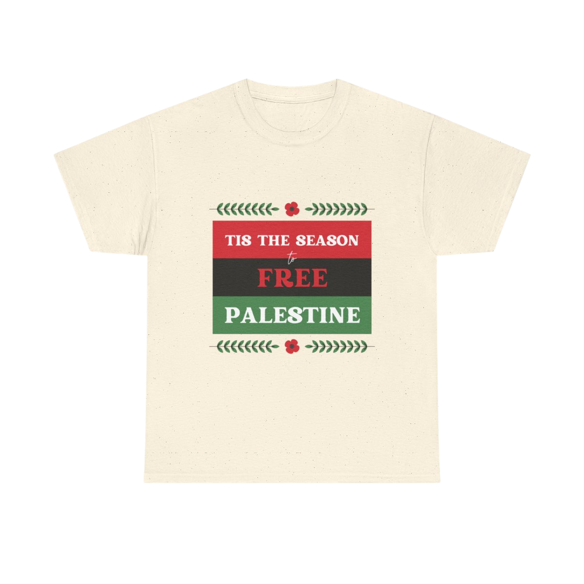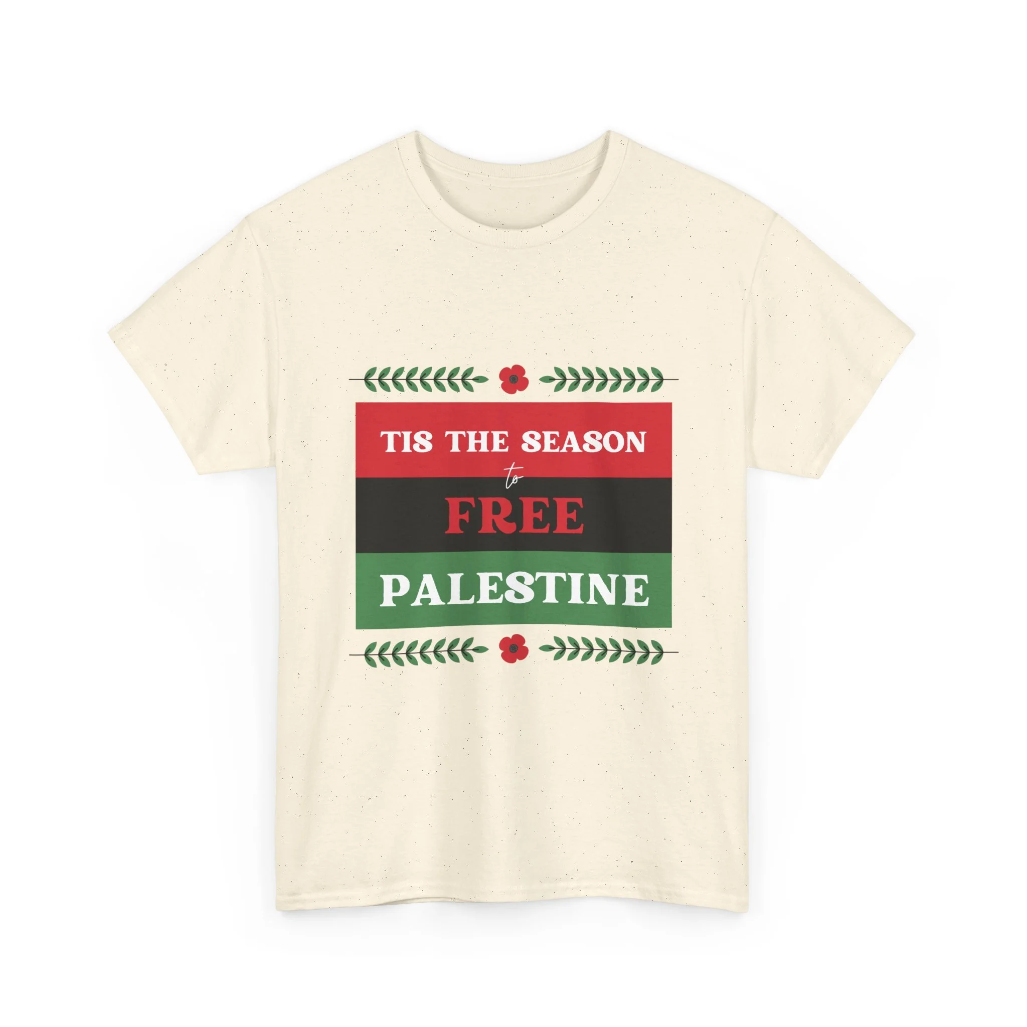 This soft, classic crewneck tee carries a clear, heart-led message wrapped in holiday colors. The front print reads “Tis the season to FREE PALESTINE” in bold red, black and green bands framed with small floral and laurel accents. Wear it to quietly stand with a cause, spark conversations, and bring a sense of community to gatherings. The relaxed fit and smooth print let the statement feel comfortable — like a warm invite to share stories, stand together, and keep hope visible during seasonal events and everyday life.
